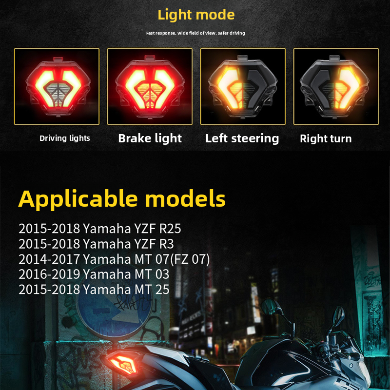 Applicable to 2015-2018 Yamaha YZF R25, YZF R3, 2016-2019 MT03, 2015-2018 MT25, and 2014-2017 MT07 (FZ07), precise original hole design, no need to change the line for installation, non-destructive replacement of the original taillight.
