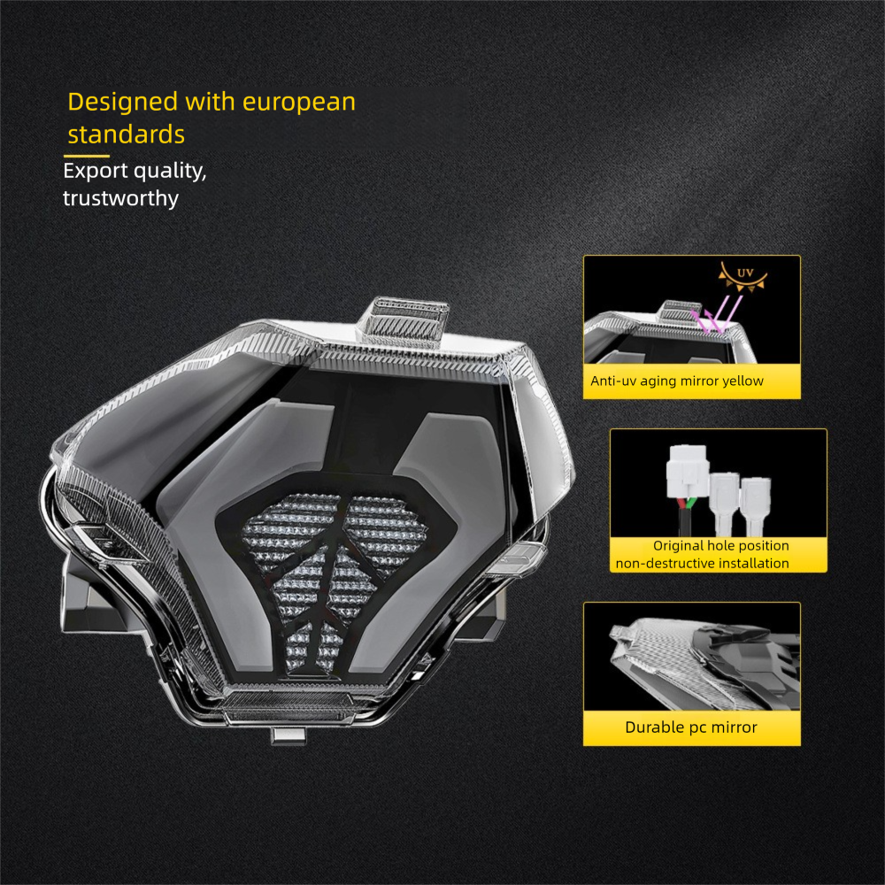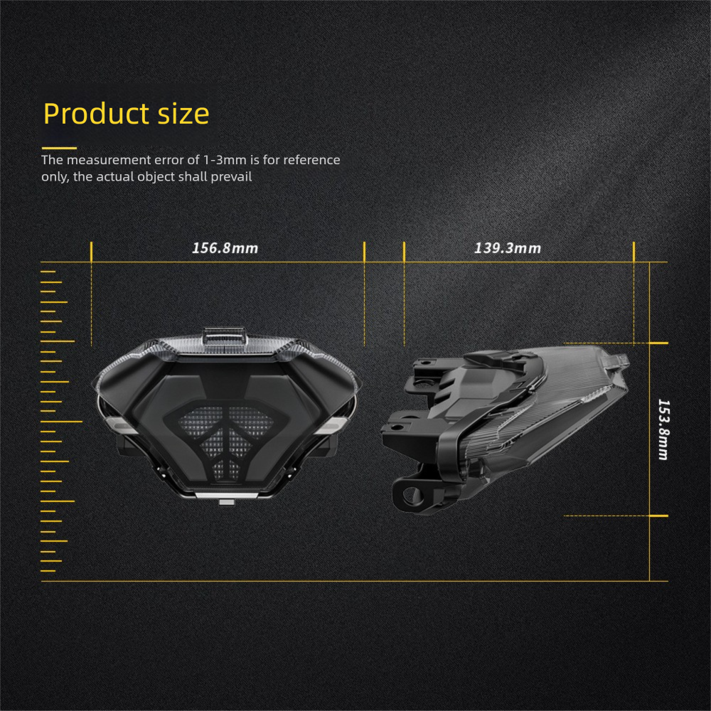This LED integrated taillight designed for the Yamaha mid-displacement series is compatible with models such as YZF R25, R3, MT25, MT03 and MT07, and combines the high performance and practicality of modern motorcycle lamps. Its multi-functional integrated light design allows riders to achieve high-response and high-visibility operations during braking, steering, and driving, effectively improving riding safety.