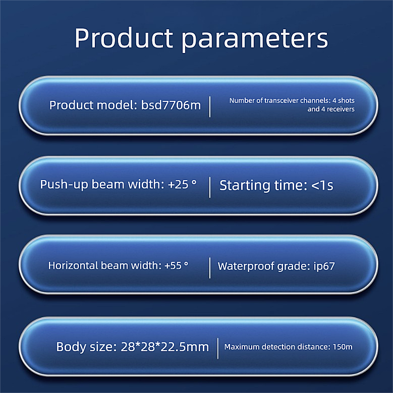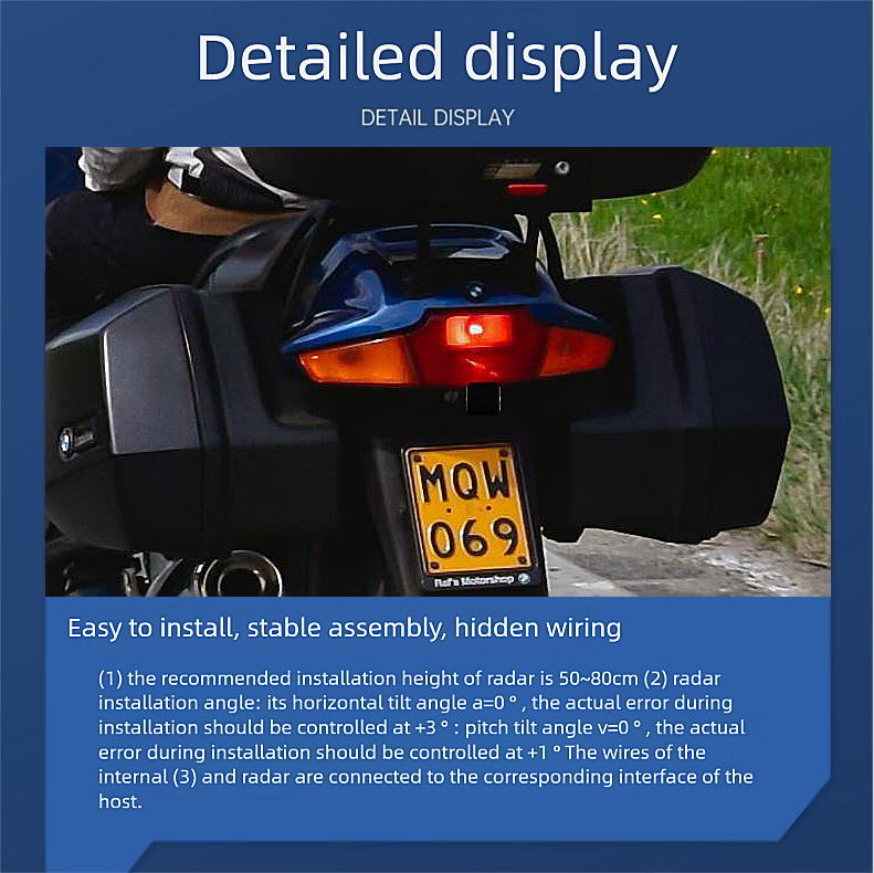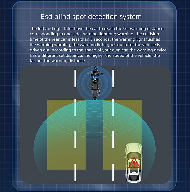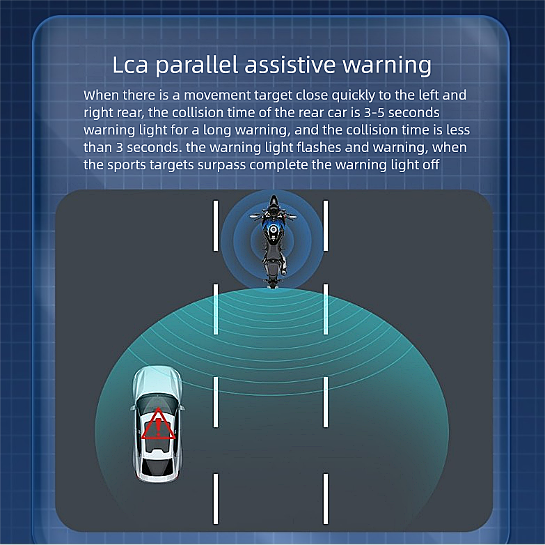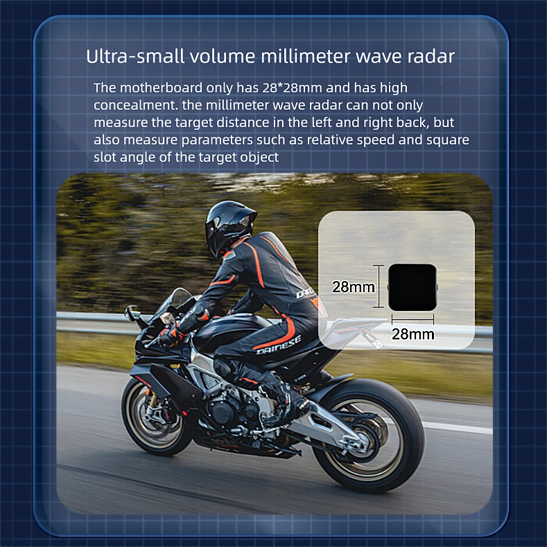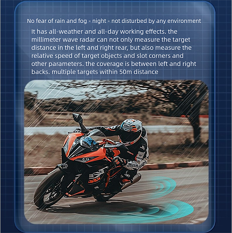 Adopting advanced 4-transmit 4-receive millimeter-wave radar technology, with ±55° horizontal beam and ±25° pitch beam width, stable detection of up to 32 targets, real-time monitoring of the left and right rear up to 50 meters, total detection distance up to 150 meters, accurate capture of vehicle blind spot dynamics, comprehensive protection of riding safety.