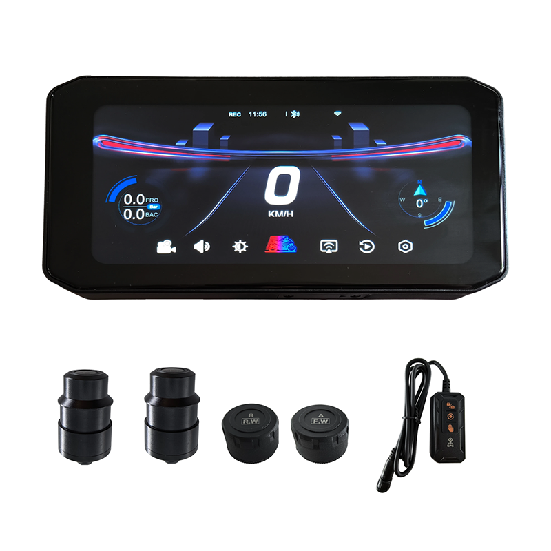 CIMOSX smart motorcycle recorder is designed for riding safety and integrates CarPlay/Android Auto intelligent interconnection, 2K front and rear high-definition wide-angle camera, BSD blind spot warning, and real-time tire pressure monitoring are integrated. The whole machine adopts IP67 waterproof and dustproof design, with high-strength shock-absorbing bracket, which can operate stably even in harsh environments. Equipped with wireless WiFi, remote preview and playback can be achieved through the App without traffic. The built-in GPS accurately records the driving trajectory, and the TS code stream format ensures data integrity.